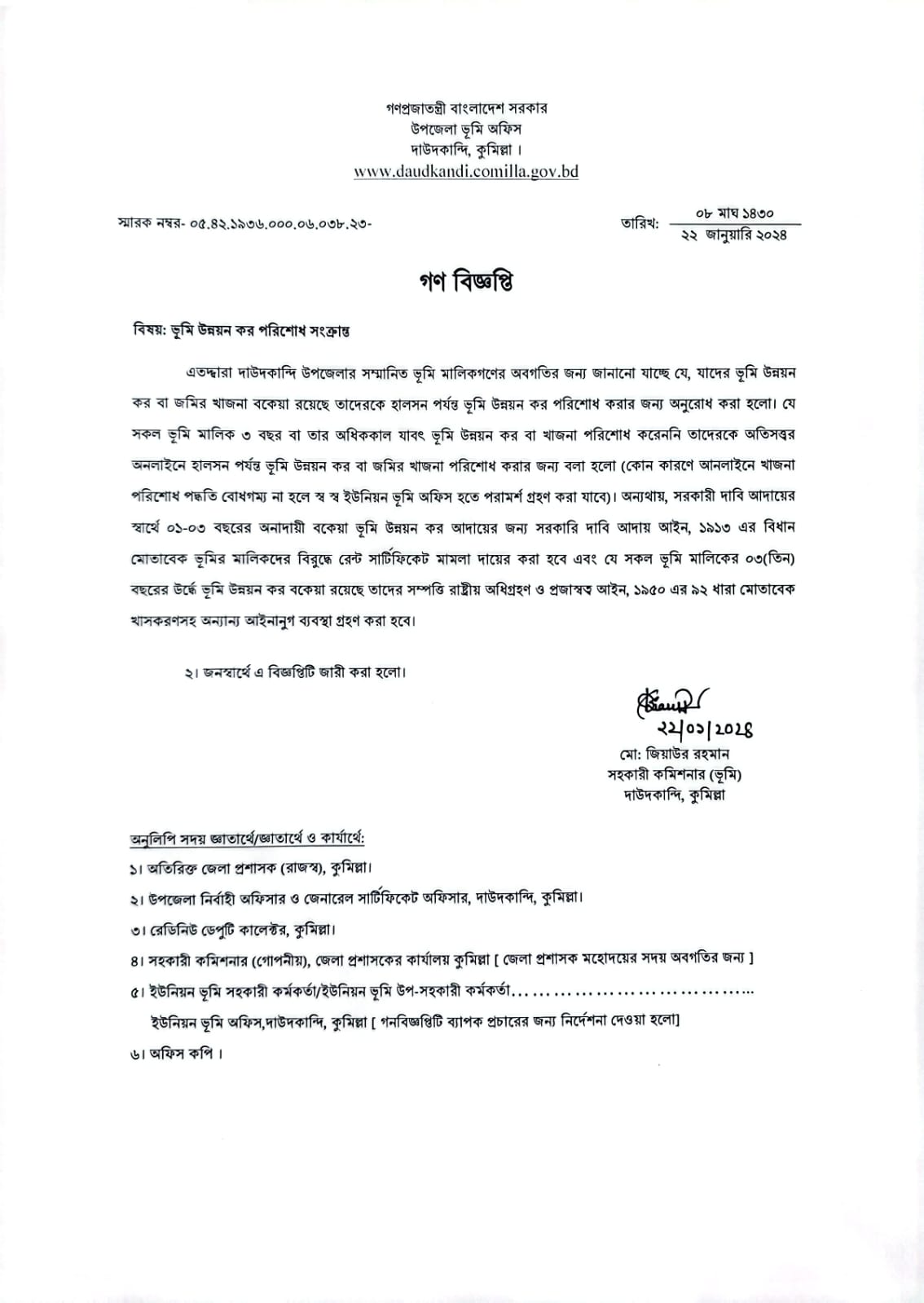 | ২ | ভূমি উন্নয়ন কর পরিশোধের গণ বিজ্ঞপ্তি | | ২২-০১-২০২৪ | দেখুন |